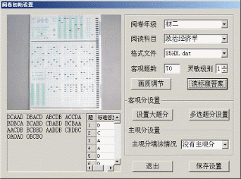 主要功能:用便宜的摄像头阅读答题卡,除了能阅读系统内置的答题卡外,还能直接阅读适用于光电阅卷机的机读答题卡。支持单选题和多选题,多选题支持部分给分。支持基本统计量(人数、平均分、标准差、变异系数)计算,分数段统计、成绩打印等功能。下面是设置标准答案的截图: |